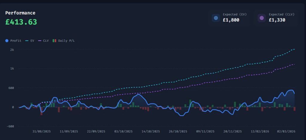 Overall, the results were profitable, but they fell short of the expected closing line value (£1330).